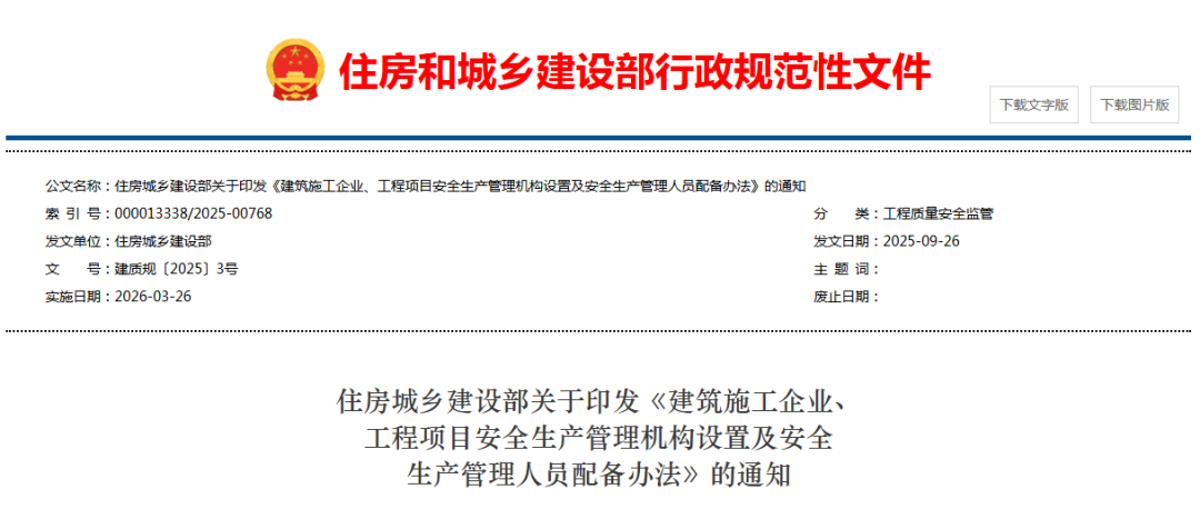 住建部近日印发新规,全面加强建筑施工企业与项目的安全管理人员配备。新办法要求特大型项目必须设安全总监,明确企业主要负责人每年需带班检查不少于25%的施工时间,并首次规定项目专职安全员在岗须佩戴记录仪,视频资料存档6个月,以压实安全生产责任。