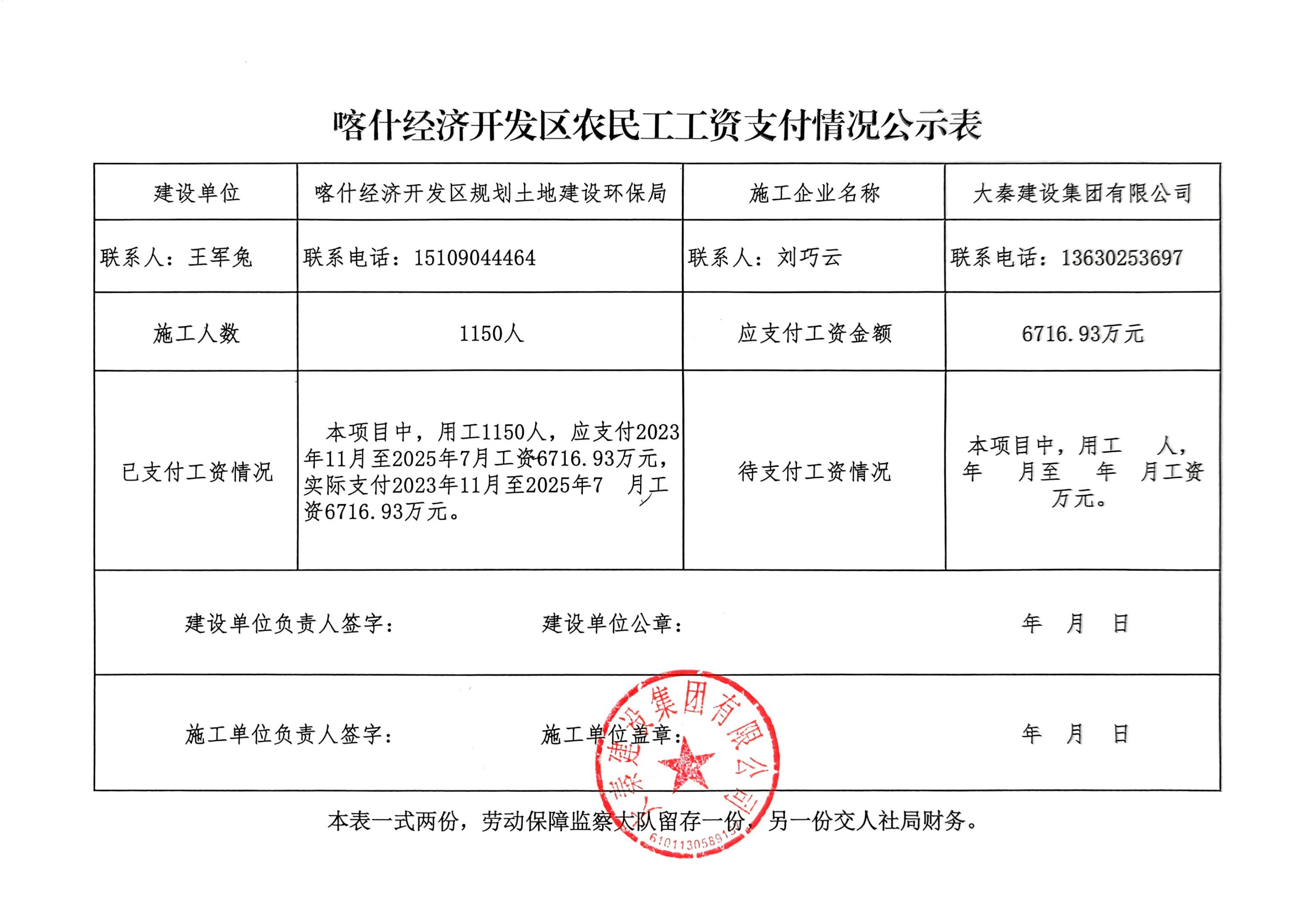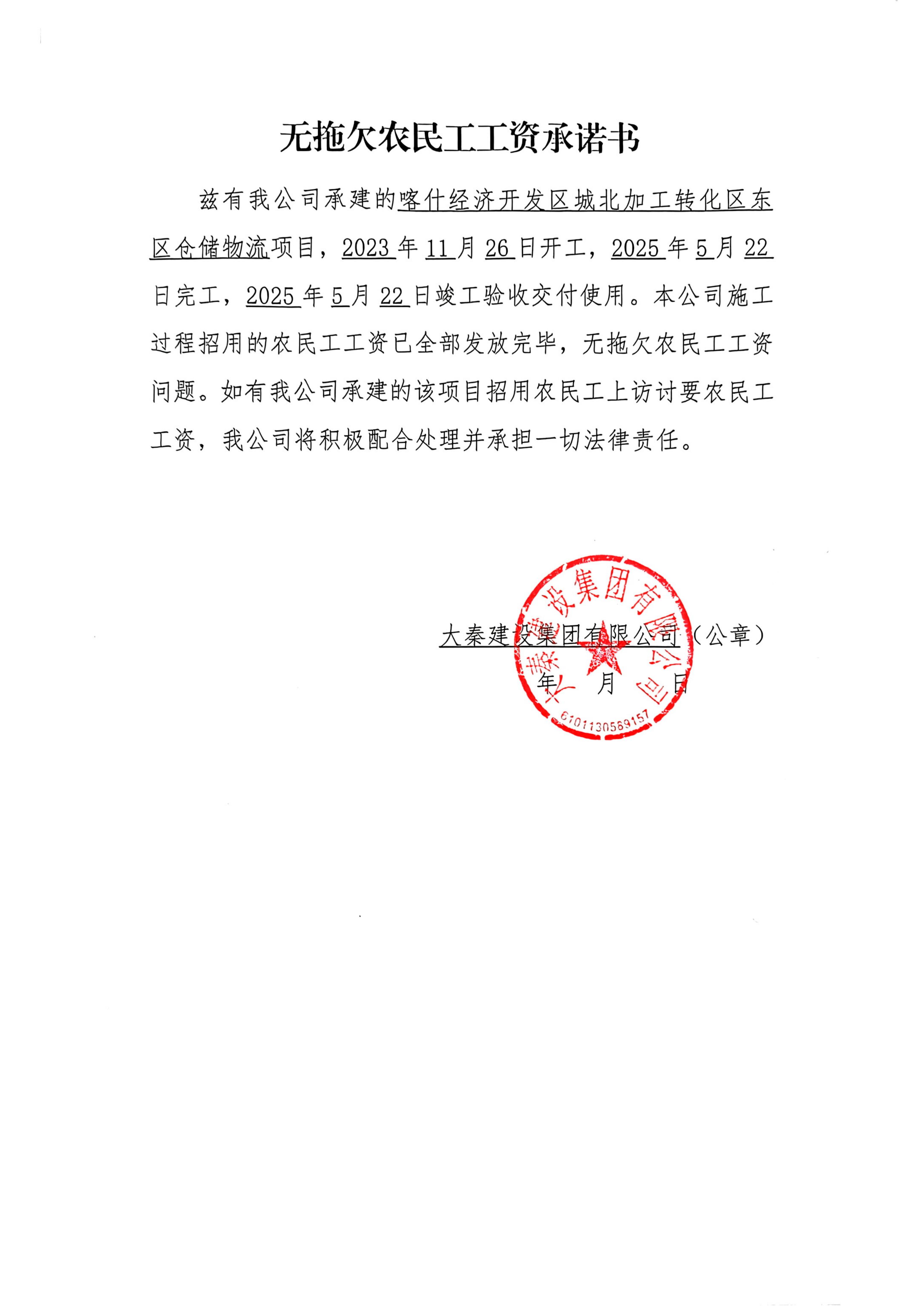 兹有我公司承建的喀什经济开发区城北加工转化区东区仓储物流项目,2023年11月26日开工,2025年5月22日完工,2025年5月22日竣工验收交付使用。本公司施工过程招用的农民工工资已全部发放完毕,无拖欠农民工工资问题。并按要求进行了无拖欠农民工工资情况公示,公示期间未发现欠薪情况。